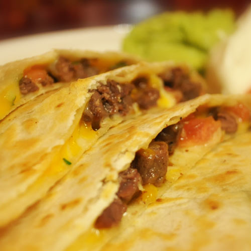 A 12 Inch Flour Tortilla Filled with Cheddar and Jack Cheeses, Your Favorite Meat (or Shrimp), Baked, and Served with Guacamole, Pico De Gallo and Sour Cream.